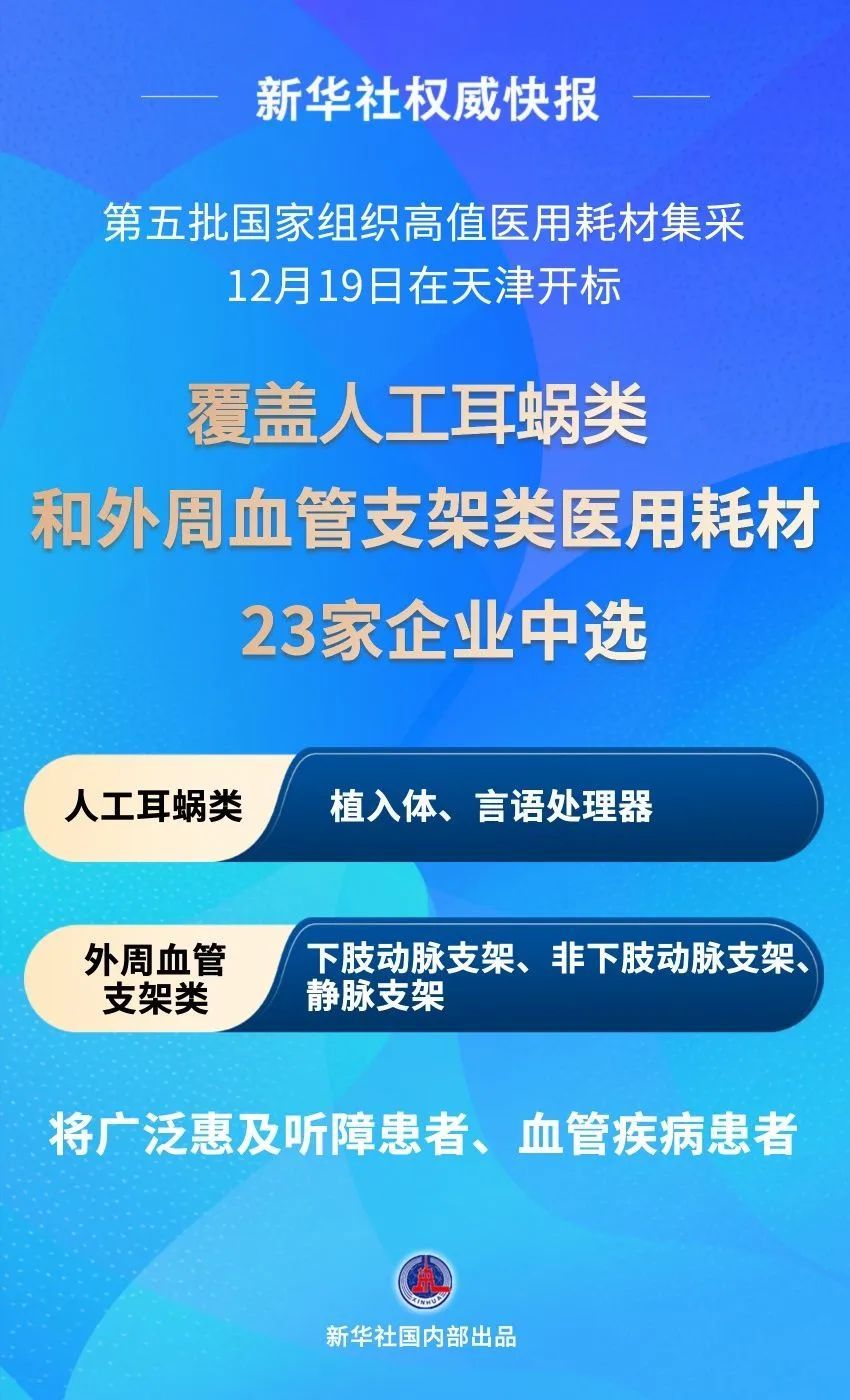 12月19日,第五批国家组织高值医用耗材集中带量采购在天津开标。此次集采覆盖人工耳蜗类、外周血管支架类医用耗材,共23家企业中选,其中人工耳蜗类耗材单套(含植入体、言语处理器)价格从平均20余万元降至5万元左右。