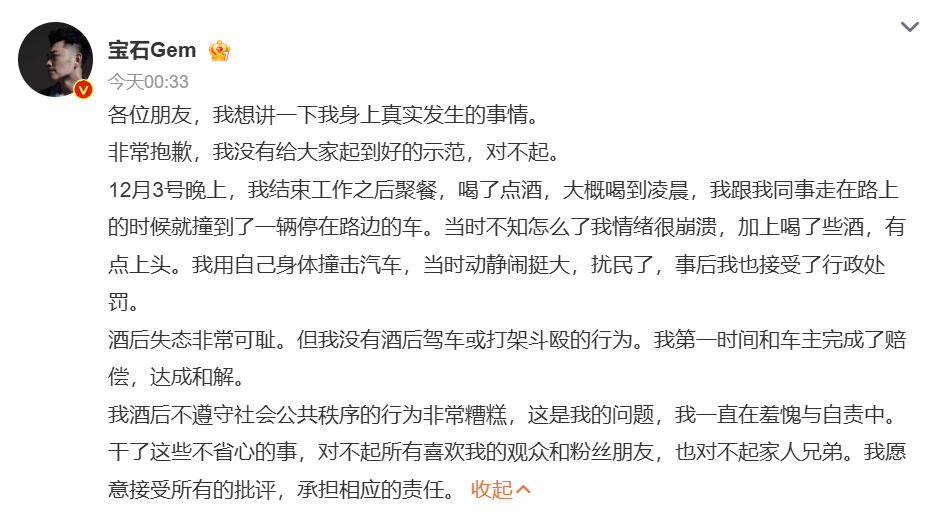 他表示,酒后失态非常可耻。但没有酒后驾车或打架斗殴的行为。第一时间和车主完成了赔偿,达成和解。