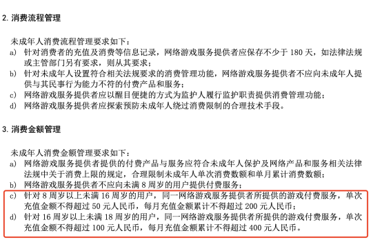 此次发布的团体标准对未成年人消费金额管理的要求,与上述要求一致。其要求网络游戏服务提供者提供的付费产品与服务,应符合未成年人保护及网络产品和服务相关法律法规中关于消费上限的规定,合理限制未成年人单次消费数额和单月累计消费数额。