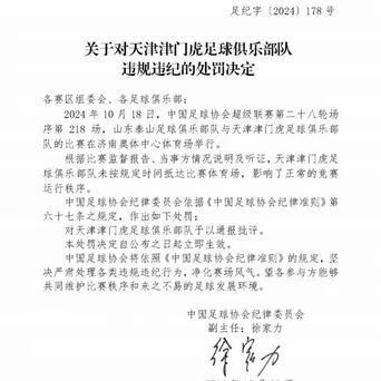 今天,中国足协宣布,天津津门虎队因在第28轮中超客场挑战山东泰山的比赛中,未能在规定时间进入赛场,而影响了正常的竞赛秩序,因此根据相关条例,给予津门虎通报批评的处罚。
