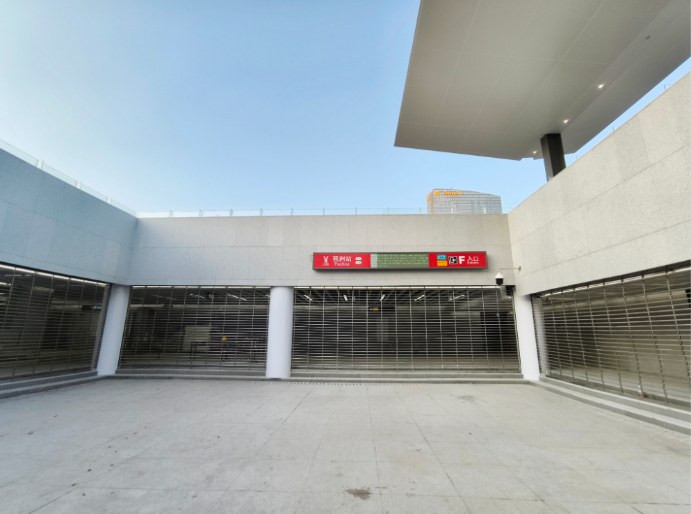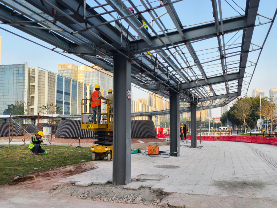 11号线F口已基本成型,一条长约220米的风雨连廊正在建设,由F口一直连到8号线A口。